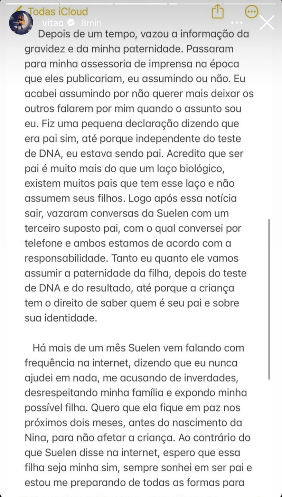 Vitão usou suas redes sociais nesta terça-feira (04.07), para se pronunciar em resposta aos desabafos feitos pela modelo Suelen Gervásio, mãe de Nina, primeira filha do cantor. Segundo Suelen, Vitão não acompanha a gestação e está proibido de acompanhar seu parto.Grávida de Vitão, Suelen Gervásio desabafa: “Viver longe de quem me faz mal”Grávida de Vitão, Suelen desabafa sobre cantor: “Lobo na pele de cordeiro”Bruna Biancardi mostra Mavie mexendo em sua barriga: “Sentindo mais”